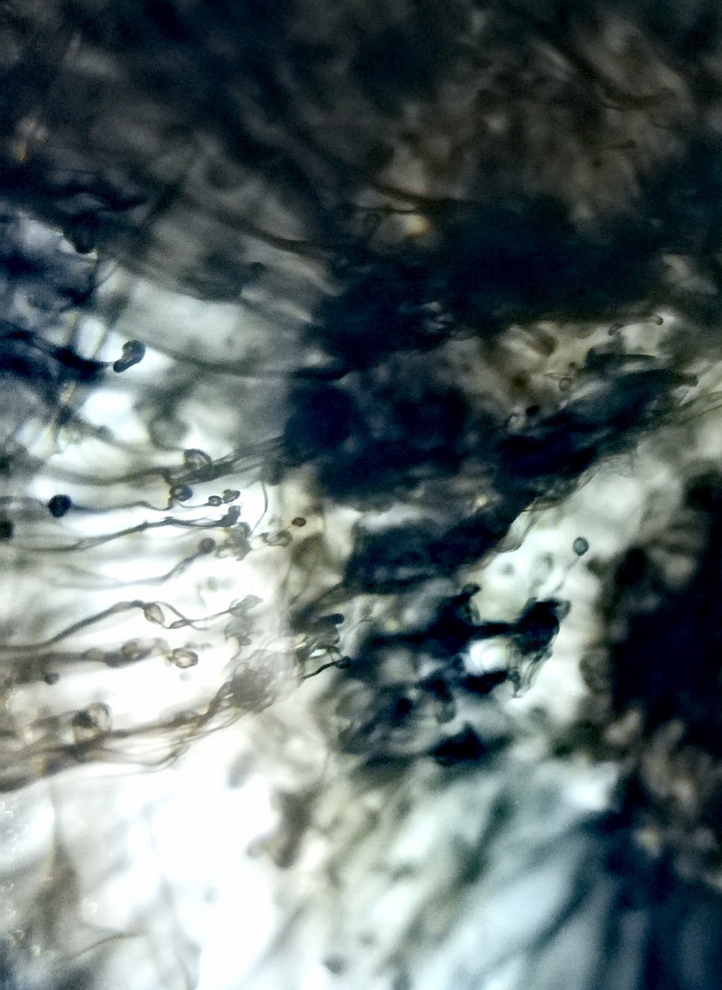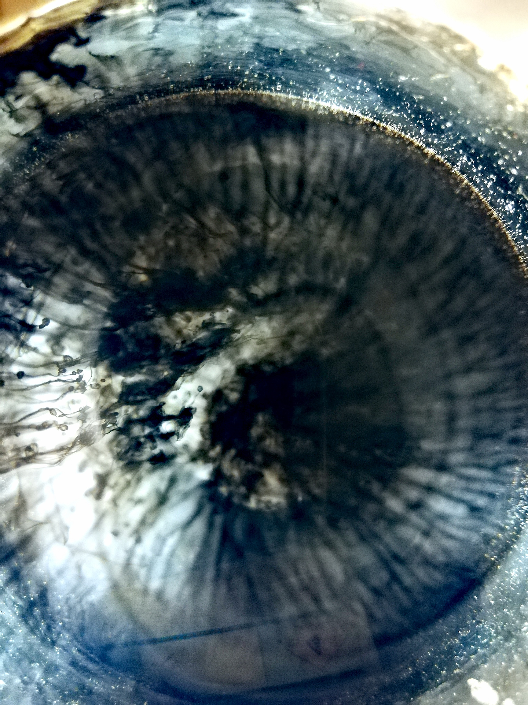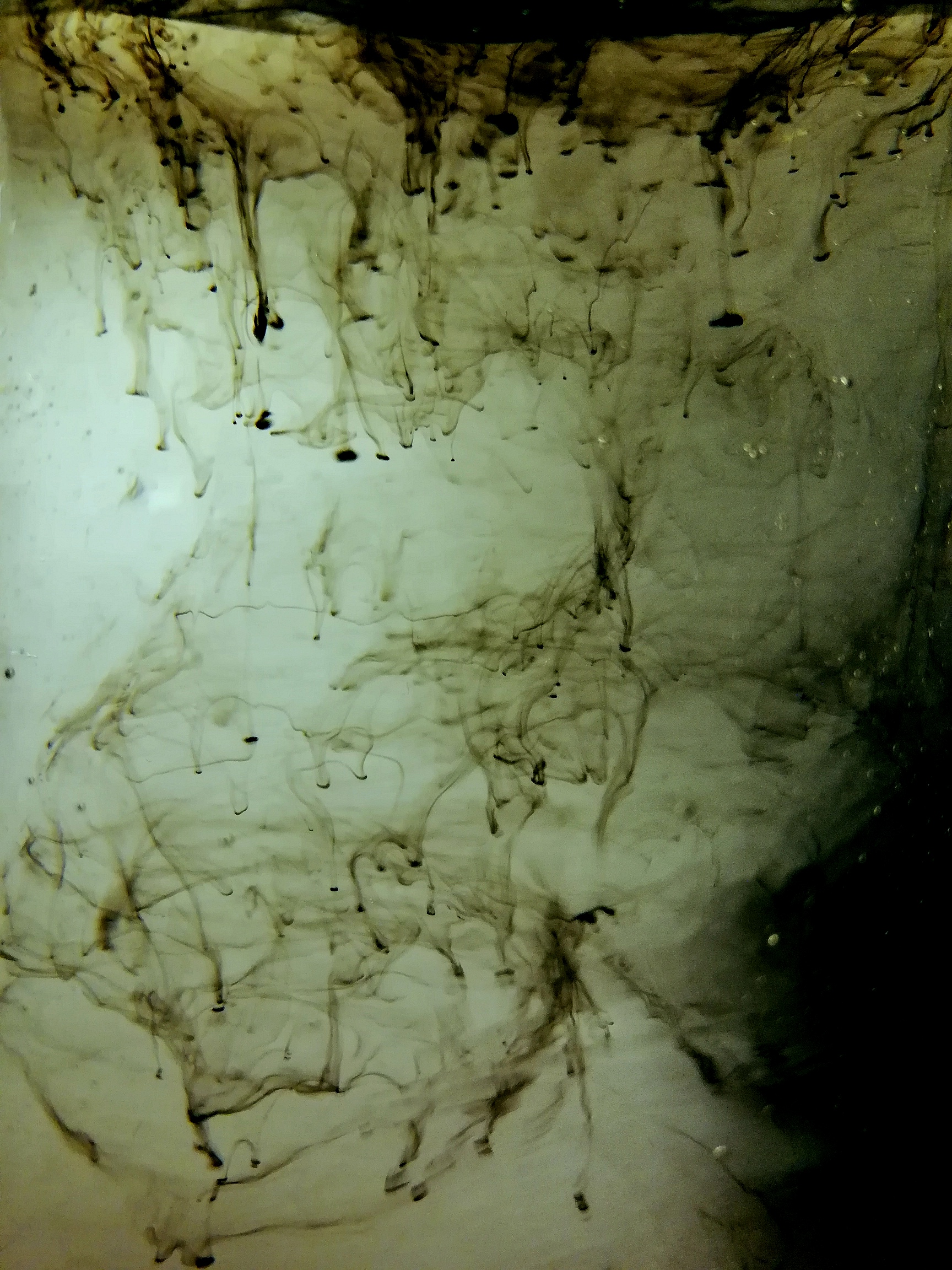 Die Bilder, die ich male beziehungsweise erstelle und mit fotografischer Hilfe festhalte, sollen zur Aufzeichnung von Bewegungen dienen. Überall gibt es Bewegungen, Menschen wie Tiere bewegen sich, Dinge werden bewegt. All diese Bewegungen, die wir in unserem Leben tun, beziehungsweise getan werden, führen uns auf Wege, die wiederum wichtig für uns sind. Es gibt keine Bewegung, die unbedeutend bleibt. Durch das Auftragen von Tusche auf Steinpapier, gelang es mir Farbverläufe sichtbar zu machen, also die Bewegung der Farben ineinander. Als ich anfing mit Zucker und Tusche auf dem Papier zu experimentieren, ergaben sich Fischschwarm ähnliche Abstraktionen. Ein ähnliches Verhalten ließ sich beobachten, als ich in einer großen Vase voll Wasser schwarze Tusche eingefüllt habe. Schwarze Tusche zieht lange dünne Fäden bis sie schließlich in kleinen Klumpen auf den Boden sinkt. Hierbei habe ich eine Parallele vom Zucker zur schwarzen Tusche gezogen, da beide ein ähnlichen Verhalten aufweisen, wenn sie mit Wasser in Berührung kommen, nämlich ihre dynamischen Linien, die mir wiederum dazu dienen ihre Bewegungen genau zu beobachten.