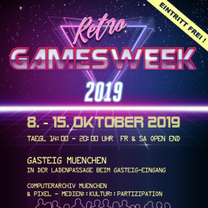 Retro Games Week 2019 – vom 8. – 15. Oktober 2019 Vom 8. – 15. Oktober 2019 veranstaltet das Computerarchiv München ( http://computerarchiv-muenchen.de ) am Gasteig im PiXEL, das ist in der Ladenpassage rechts vor dem Gasteig-Eingang, die Retro Games Week 2019. Dabei kann man täglich, ganze sieben Tage lang bei freiem Eintritt, jeweils in […]