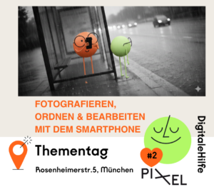 PIXEL Rosenheimer Str. 5 81667 München 16:00 – 17:30 kostenfrei Unsere Smartphone-Kameras und die Galerie können oft mehr, als wir im Alltag nutzen. An diesem Thementag probieren wir gemeinsam aus, welche Funktionen hilfreich sind und wie sich Fotos und kurze Videos einfach umsetzen lassen. Außerdem schauen wir, wie Bilder übersichtlich organisiert und einfach bearbeitet werden […]